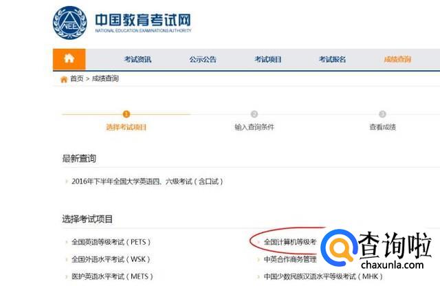 登录中国教育考试网,找到成绩查询这一项,点击“全国计算机等级考试”。