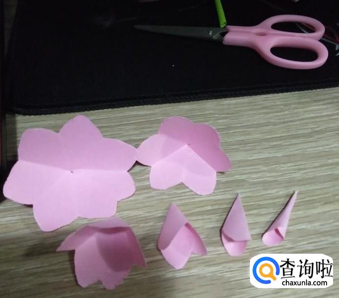 将做好的3朵花分别用剪刀剪去一片花瓣,两片花瓣,三片花瓣,如下图所示。