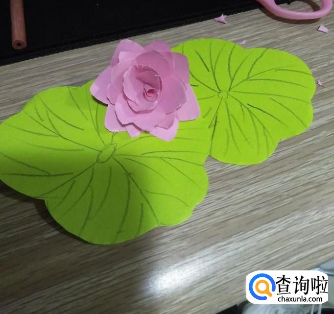将两片莲叶放在一起,莲花放于其上,diy睡莲就做好了,