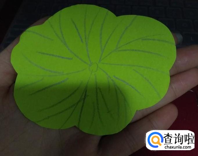 7X7cm的纸用剪刀剪成荷叶状,再用铅笔画一些莲叶弧线如下图所示