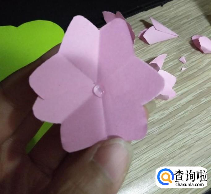 用胶棒涂抹花瓣剪切口边缘,然后将切口的两瓣花粘起来,6片花瓣都如此,做好后如下图2,形成6多小花。
