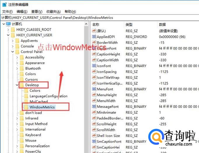 双击打开Control Panel文件夹,打开Desktop下面的Window Metrics选项,如下图所示