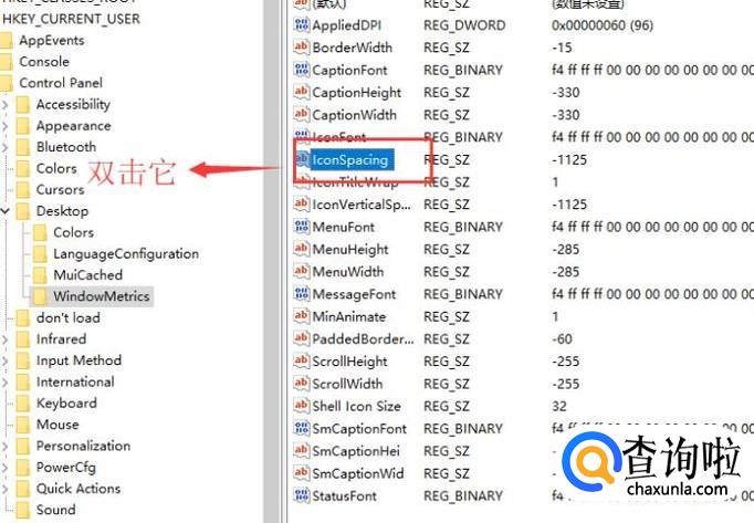 在右侧找到IconSpacing选项,用鼠标双击此选项,如下图所示