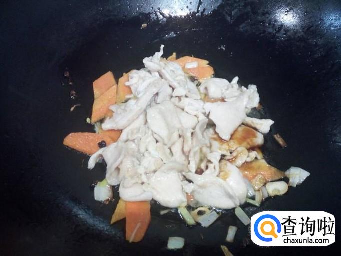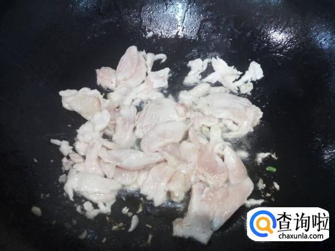 锅里放入油加热,油热后放入鸡胸肉滑炒,炒至鸡胸肉颜色变白,盛出备用。
