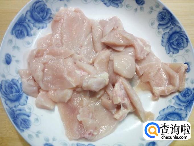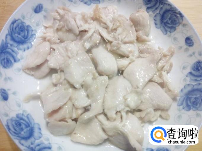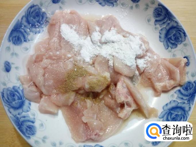 鸡胸肉用水清洗干净,控干水分,切成片。放入少许盐,料酒,五香粉,淀粉,用手抓匀,腌制十五分钟。