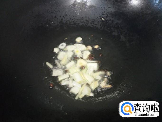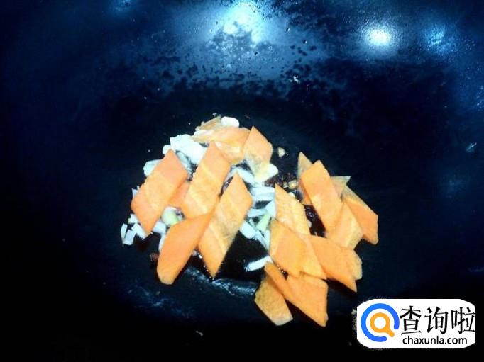 锅里重新放入油加热,油热后放入花椒,葱,姜,蒜,爆锅。放入胡萝卜片炒至变软。