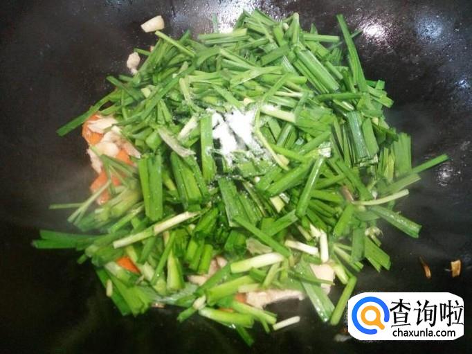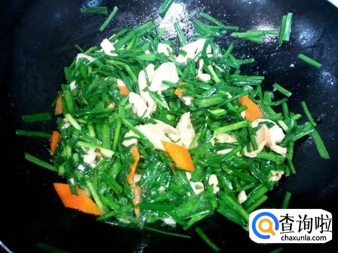 放入鸡胸肉,料酒,蚝油,稍翻炒一下,随即放入韭菜翻炒,放入盐。