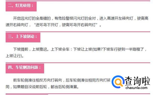 在做题的时候,要注意一些形容词,比如加速、猛打、紧急等这种描述性的词语一般都是错误。还有关于汽车灯的使用问题,比如转向灯、远光灯、闪光灯。