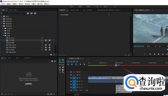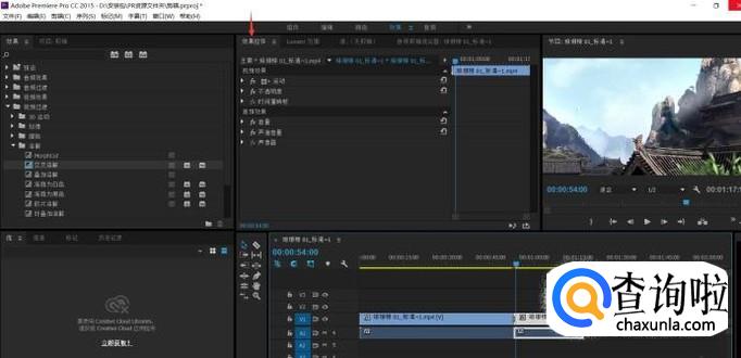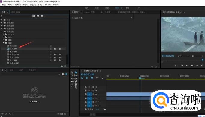 效果控制面板可为视频添加效果。例如视频过渡时,添加交叉溶解效果“效果——视频过渡——溶解——交叉溶解”,拖动效果至两段视频衔接处即可