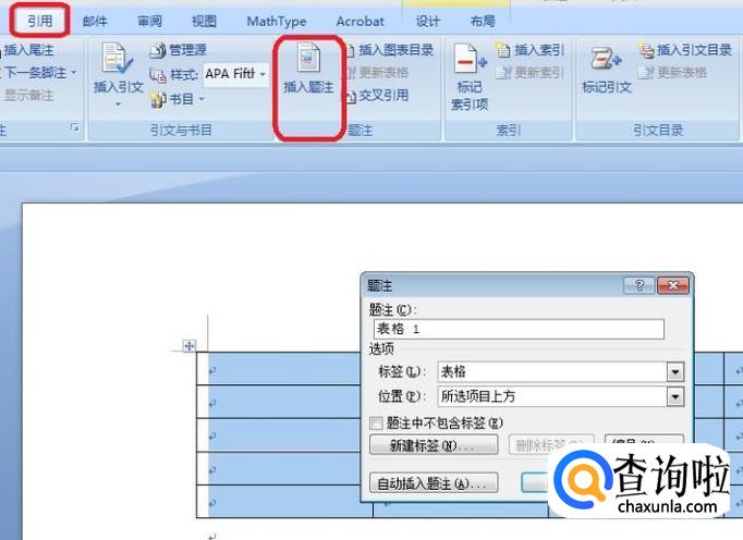 第二种方法,全选表格后,点击标题栏“引用”,在下方工具栏我们看到有“插入题注”按钮,点击一下,同样弹出“题注”选项框,进行相同设置就可以了。