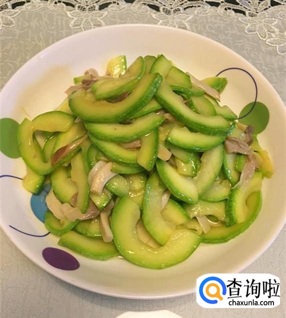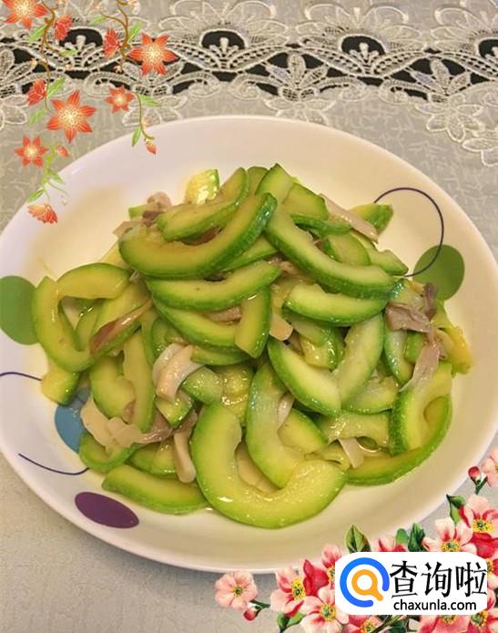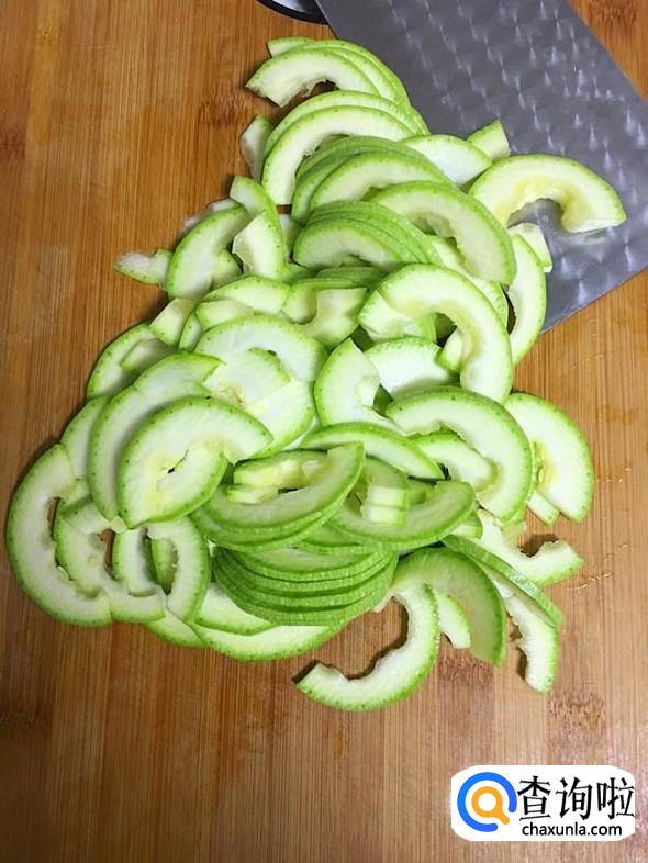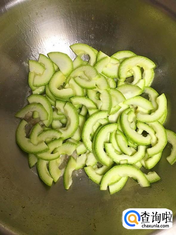 炒至有少许汁水渗出时,放入切成薄片的葫芦瓜。