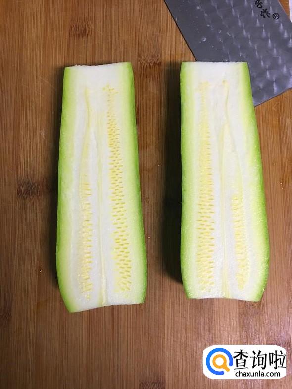 葫芦瓜清洗干净后,切去两头,然后对半剖开。