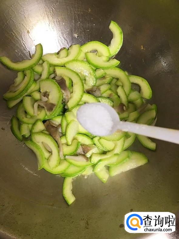 继续大火翻炒,当葫芦瓜变软时,加入1小勺盐调味。