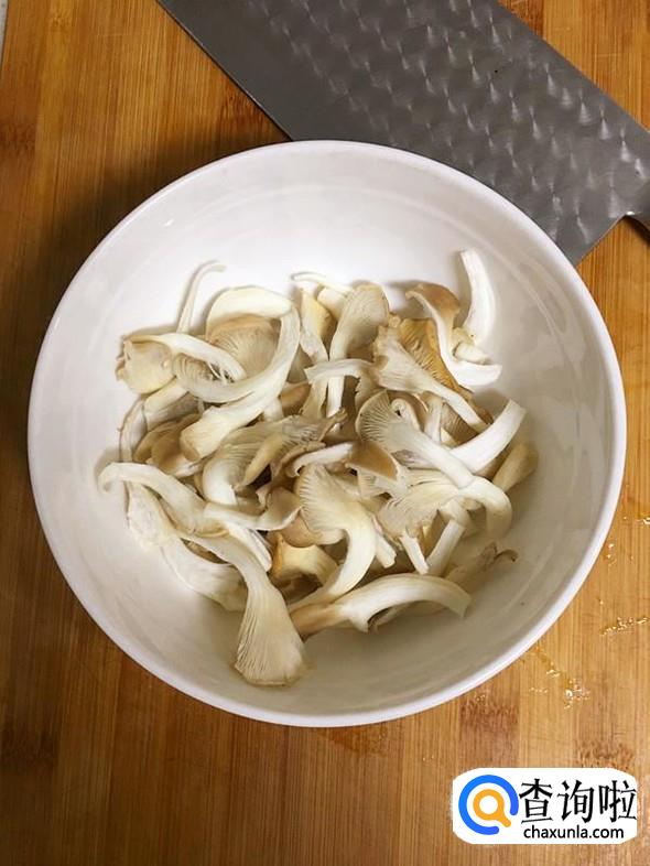 秀珍菇撕成小片,清洗干净,沥干水分放入碗中待用。这里的秀珍菇可以换成你所喜欢的其他菌菇。