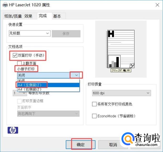 然后我们将双面打印给勾选上,之后点击小册子打印边上的下拉箭头,弹出的界面,我们点击A4(左侧装订),之后我们点击确定;