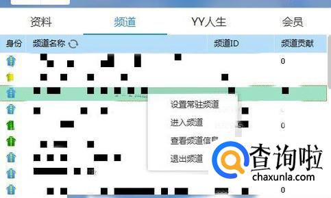 然后在这些频道中找到你想设置为常驻的YY频道,然后点击右键,就有四个选项,其中就有设置为常驻频道。