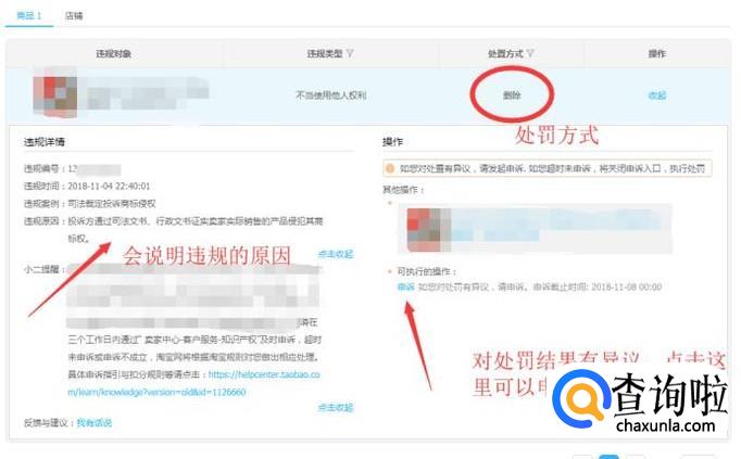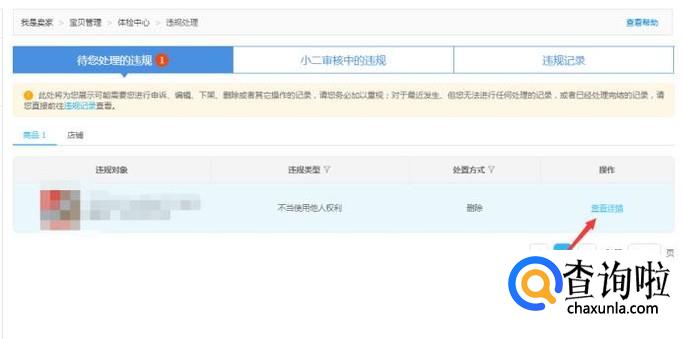在待处理违规的页面,违规对象就是被投诉店铺里的某款宝贝,违规类型,处罚形式和操作都会在这里详细明说,点击“查看详情”