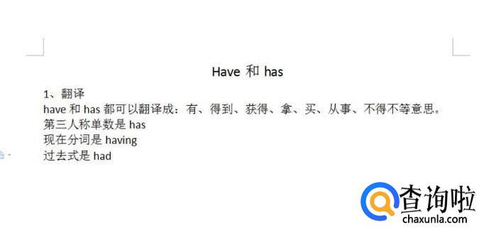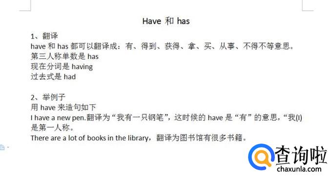 have和has都可以翻译成:有、得到、获得、拿、买、从事、不得不等意思。而have的第三人称单数是has,现在分词是having,过去式是had。