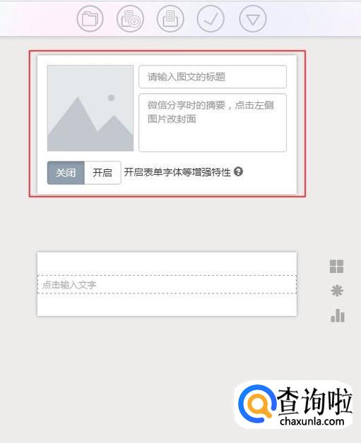 在秀米图文编辑页面中,中间的位置显示的就是我们编辑区域,最上方是保存复制一些功能,下面的就是图文的标题,描述等内容。