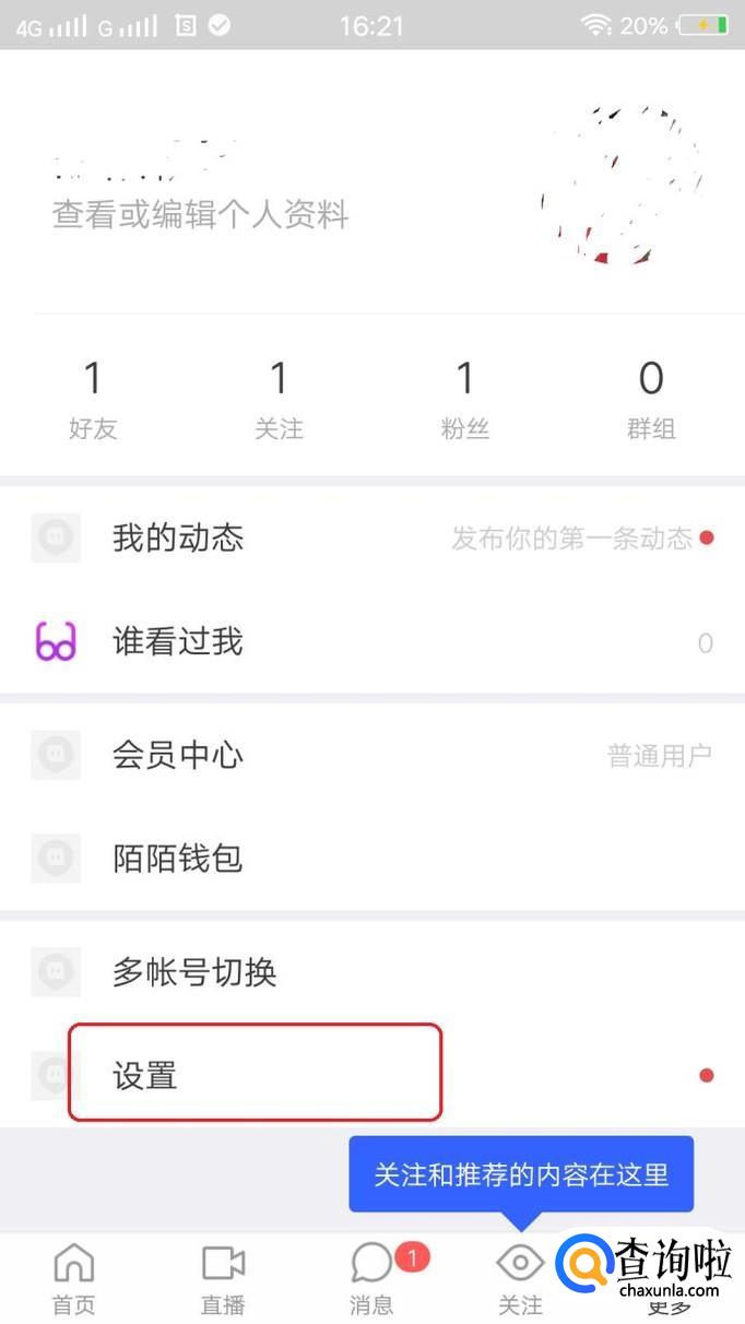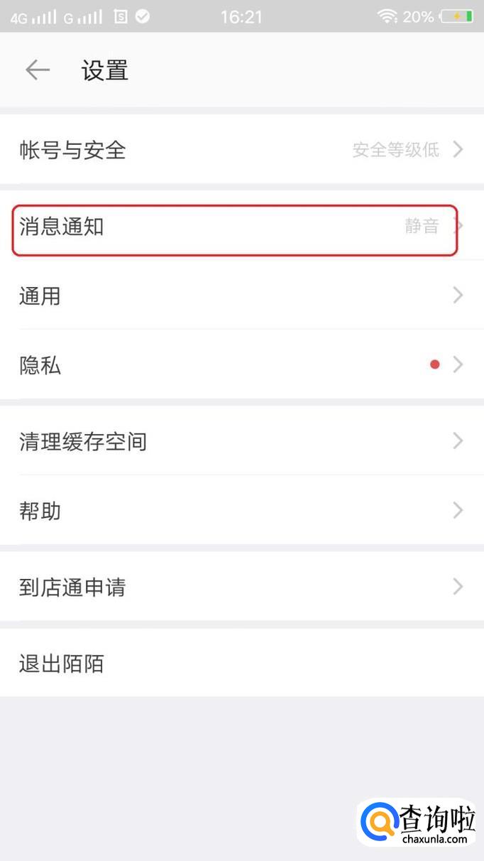 进入个人设置界面,点击“设置”,在下一页面点击“消息通知”。