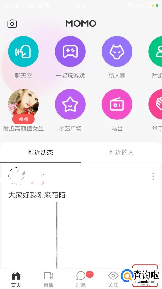 第一种操作,对陌陌软件进行声音设置。打开陌陌,登录以后,来到陌陌首页,点击右下角“更多”。