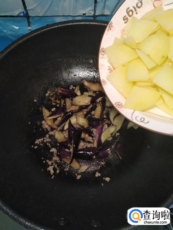 将准备好的土豆倒入锅中,和茄子一起翻炒均匀。