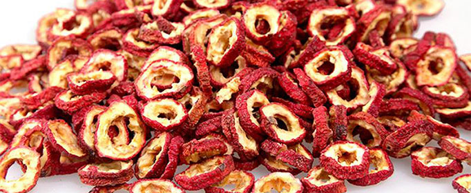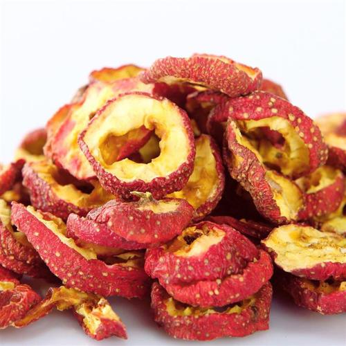 山楂干都是采用优质的大颗粒果实,类球形,直径0.8~1.4cm,经手工切片,烘干而成。表面棕色至棕红色,并有细密皱纹,顶端凹陷,有花萼残迹,基部有果梗或已脱落。生于山谷或山地灌木丛中,山楂树适应能力强,抗洪涝能力超强,容易栽培,树冠整齐,枝叶繁茂,病虫害少,花果鲜美可爱,因而也是田旁、宅园绿化的良好观赏树种。