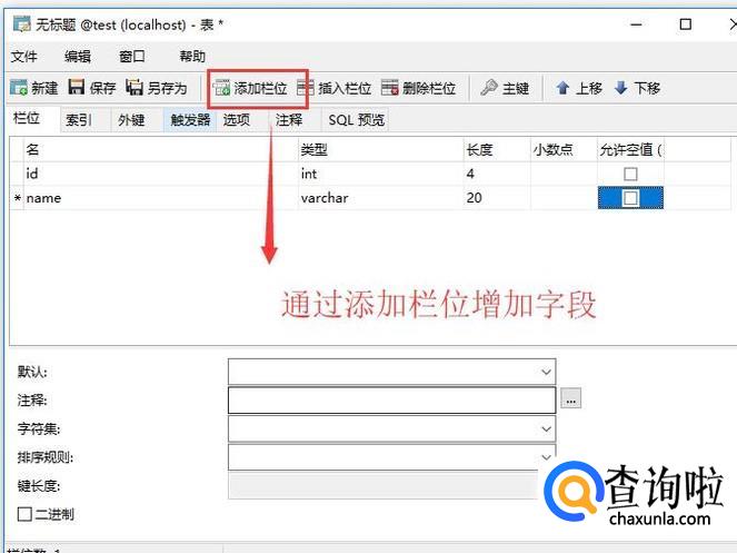 接下来在弹出的新建表界面中,我们通过添加栏位来增加表的字段,如下图所示