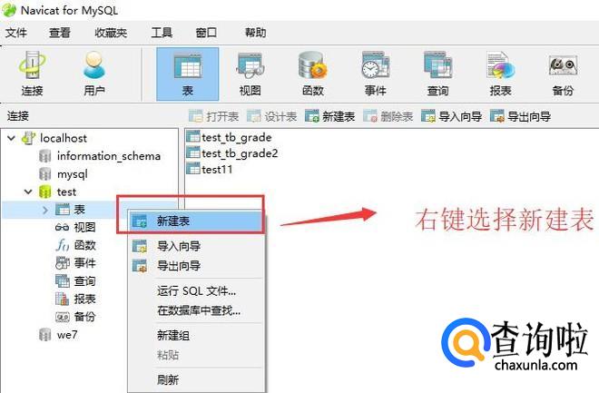 首先打开navicat for mysql工具,打开一个数据库,然后右键单击表,选择新建表,如下图所示