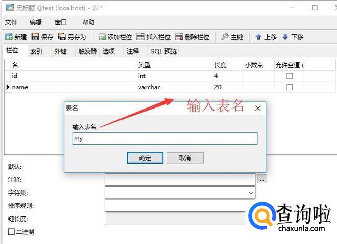 字段都添加完毕以后,我们按Ctrl+S组合键,这个时候会让你输入表名,我们输入完毕点击确定即可,如下图所示