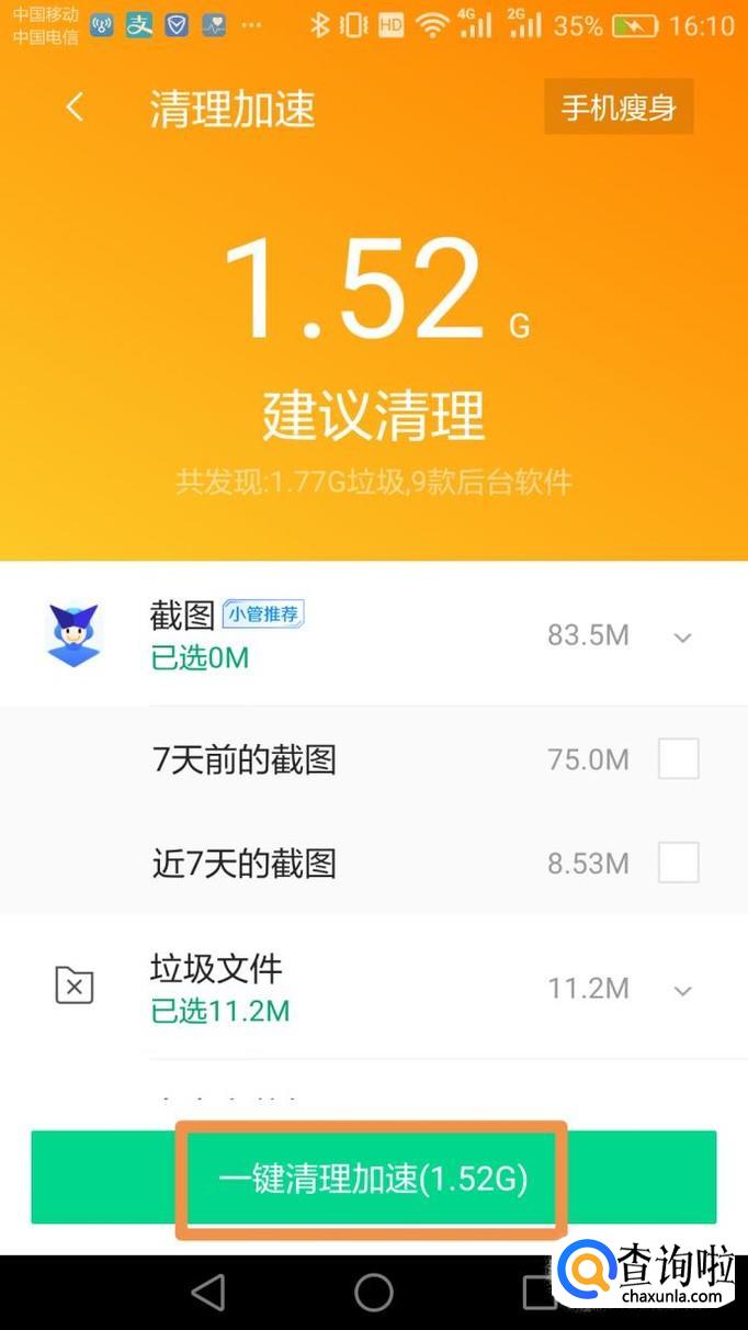 清理完扫描的垃圾数据后,还需要对手机进行进一步的清理加速,可以点击页面右上角的“手机瘦身”,对占用手机内存并且影响网速的的所有无用内容进行清理,比如点击“微信清理”可以对聊天语音、图片、软件自动下载的视频文件等进行清理。深度清理出一定内存后,手机的上网速度会明显加快。