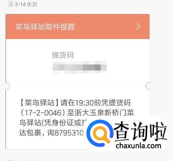 最简单的方法就是通过手机短信来查看,菜鸟驿站收到货后一般都会发送短信到你的手机上,如下图: