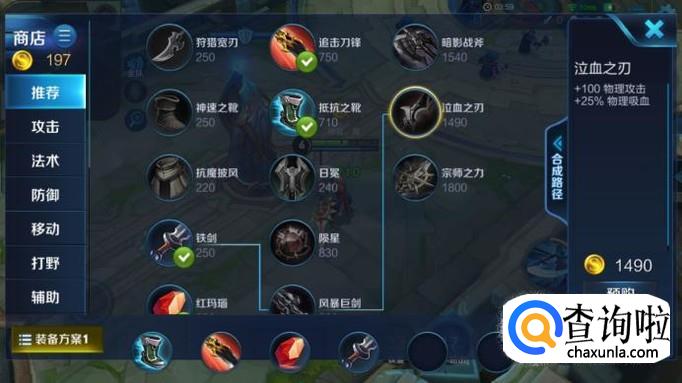接下来还可以出一把可以吸血的装备,比如“泣血之刃”,这样对于打野以及帮助队友也是有好处的,至少去帮忙的时候不那么容易死。