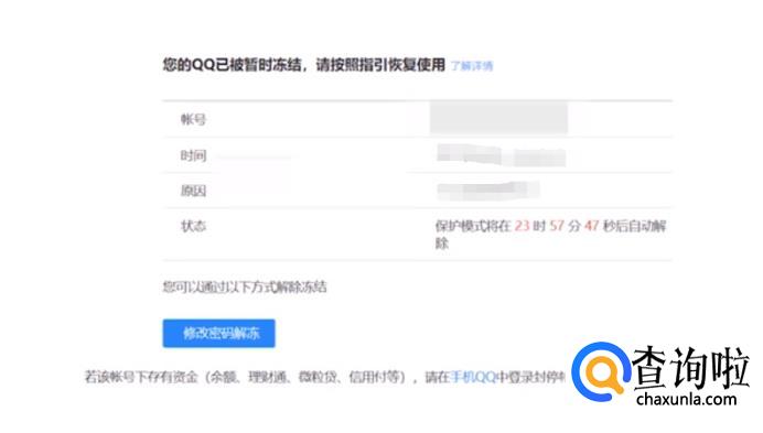 或者你也可以点击“修改密码解冻”,根据系统提示,输入要解冻的QQ帐号,通过QQ绑定的手机号进行验证,验证成功后重置密码即可解除冻结。
