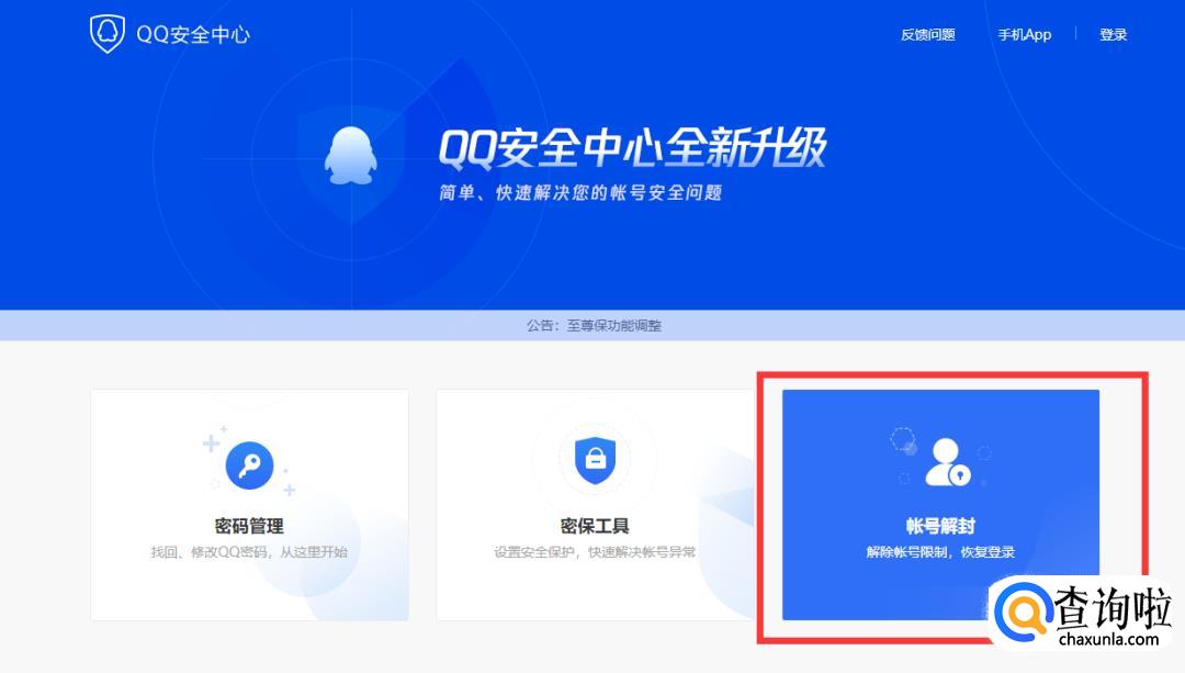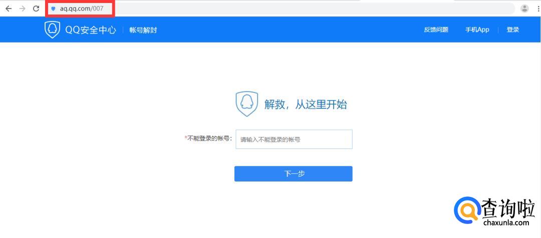 在电脑浏览器中打开QQ安全中心-帐号解封地址:aq.qq.com/007