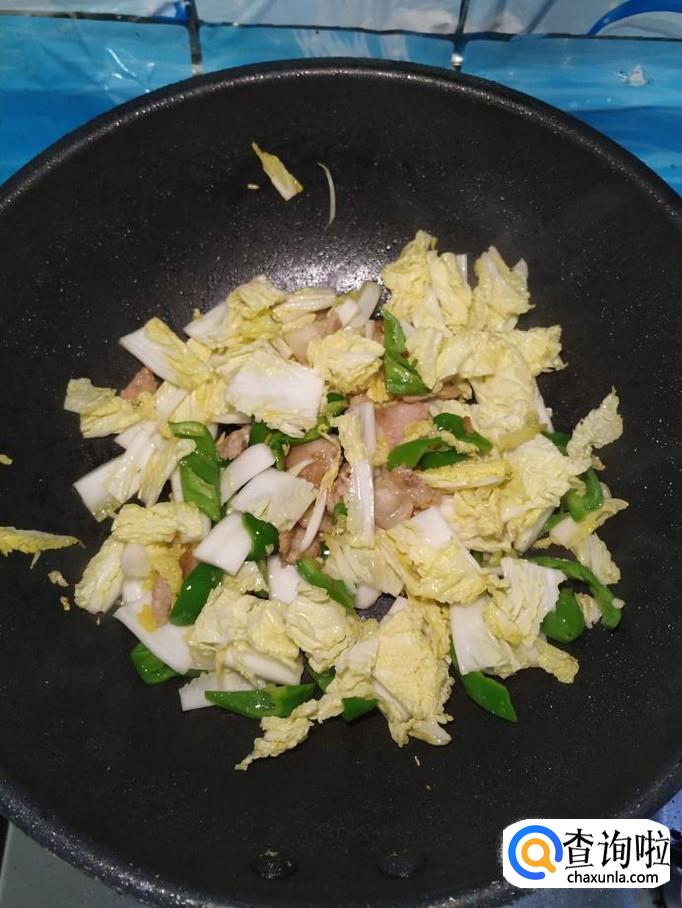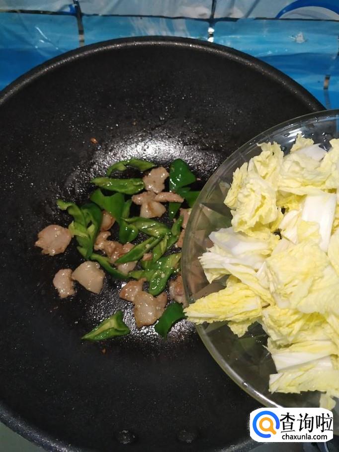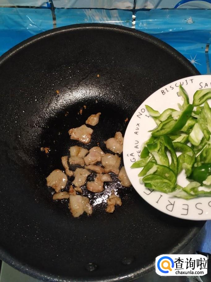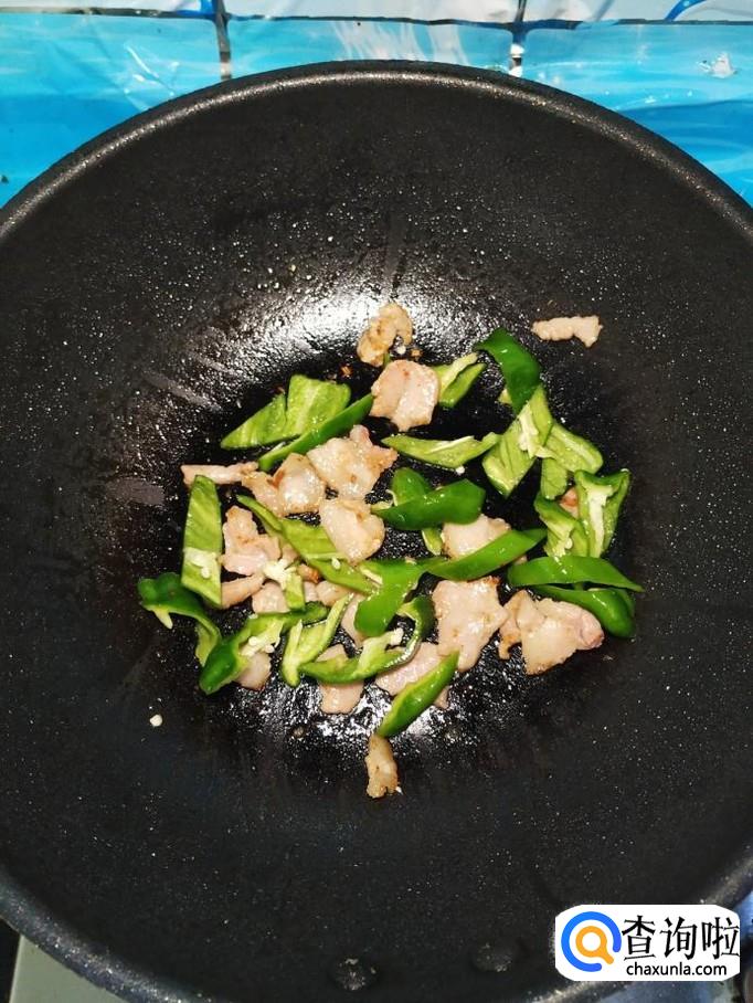 然后将切好的青椒丝倒入锅中,和五花肉一起翻炒均匀。