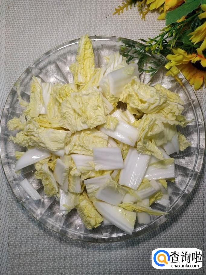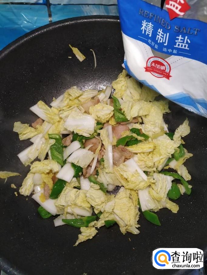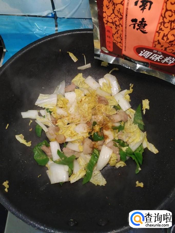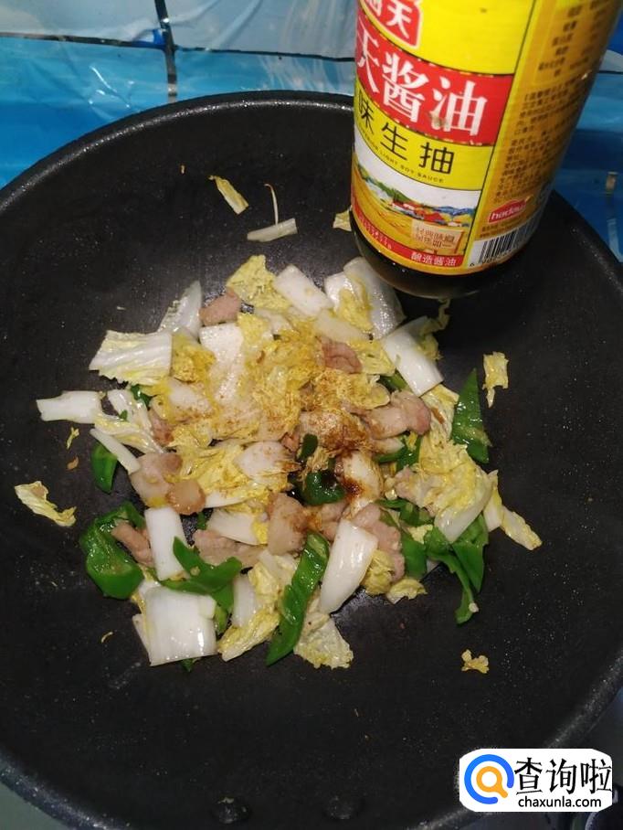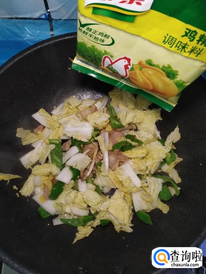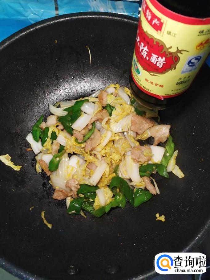 娃娃菜适量,青椒适量,五花肉适量,生姜适量,盐适量,鸡精适量,五香粉适量,淀粉适量,陈醋适量。