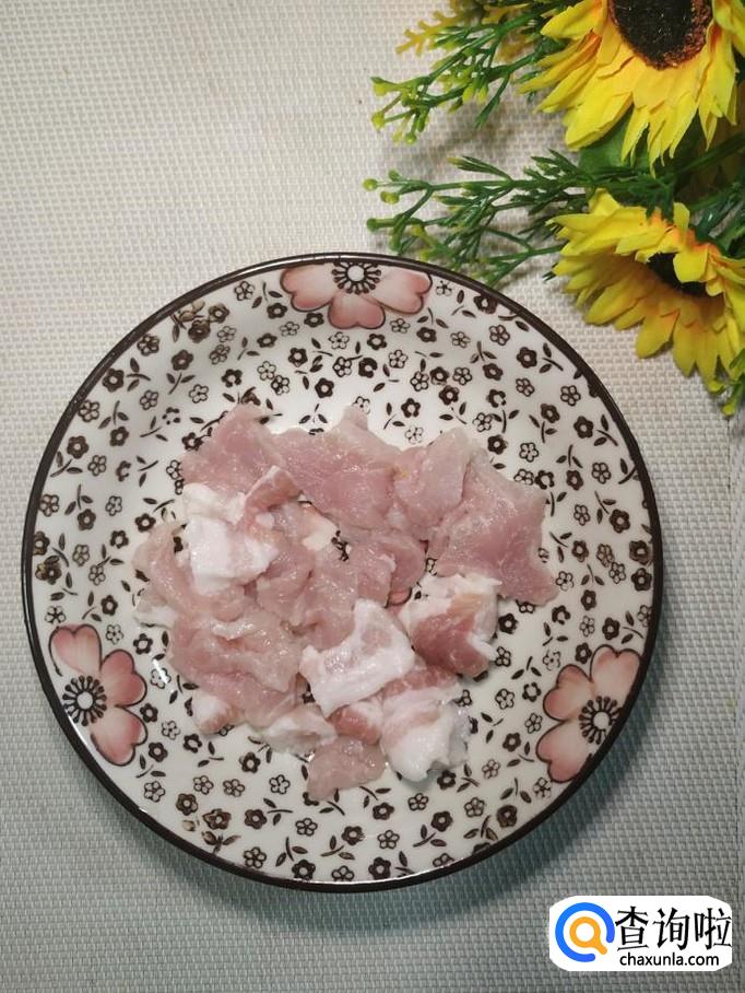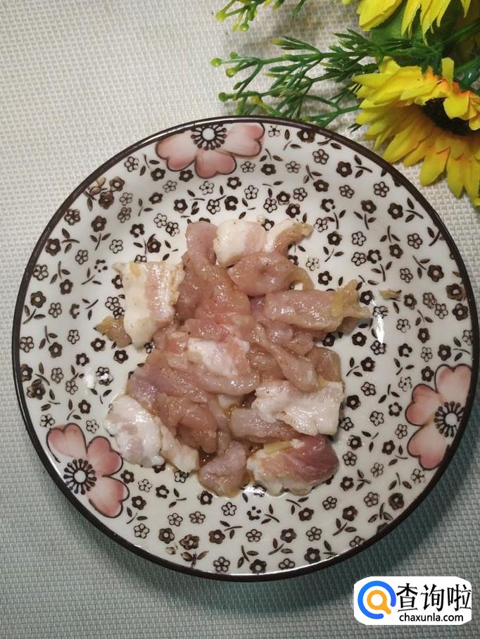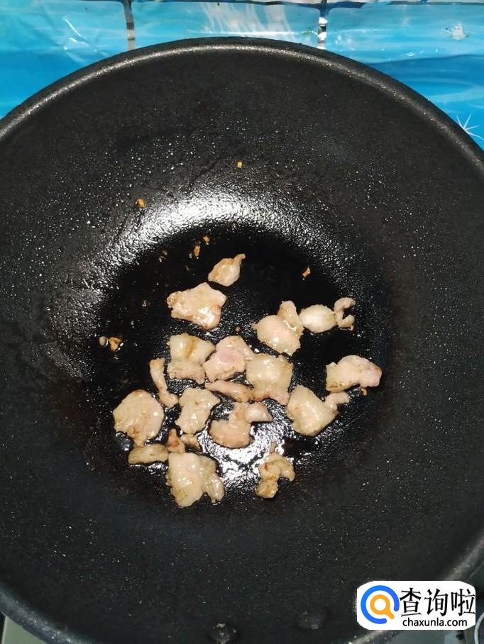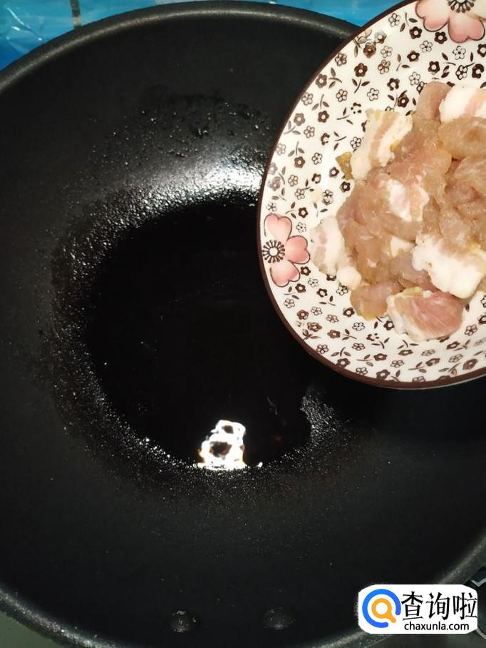 炒锅中放入适量油,油热后,将腌好的五花肉片,放入锅中炒熟,炒至五花肉表面变色,就差不多熟了。