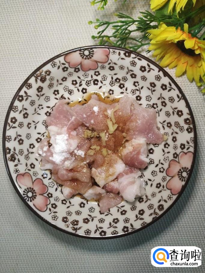 准备适量五花肉,洗净后切片,再准备适量生姜,洗净后切碎,放在上面,放入适量盐,鸡精,五香粉,生抽,料酒,搅拌均匀,腌制15分钟左右。