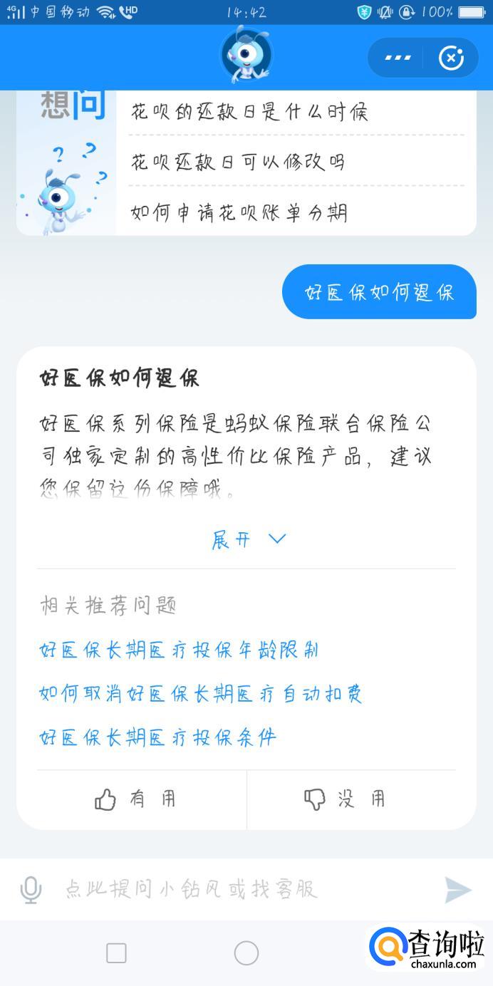 在对话输入框中输入“好医保医疗如何退保”,然后发送,接着就会弹出“点击选择交易”的对话框,我们单击按钮就可以了。