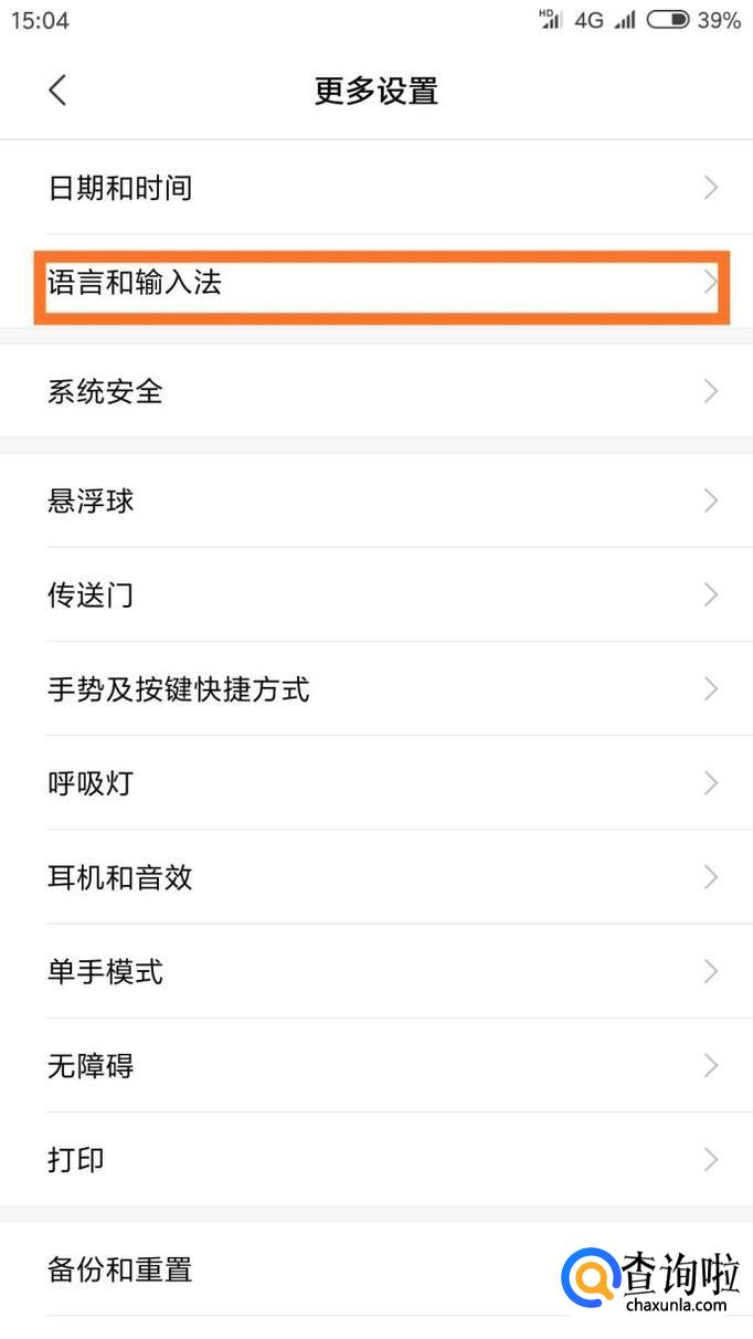 点击更多设置,在更多设置里面找到第二栏的“语言和输入法”。