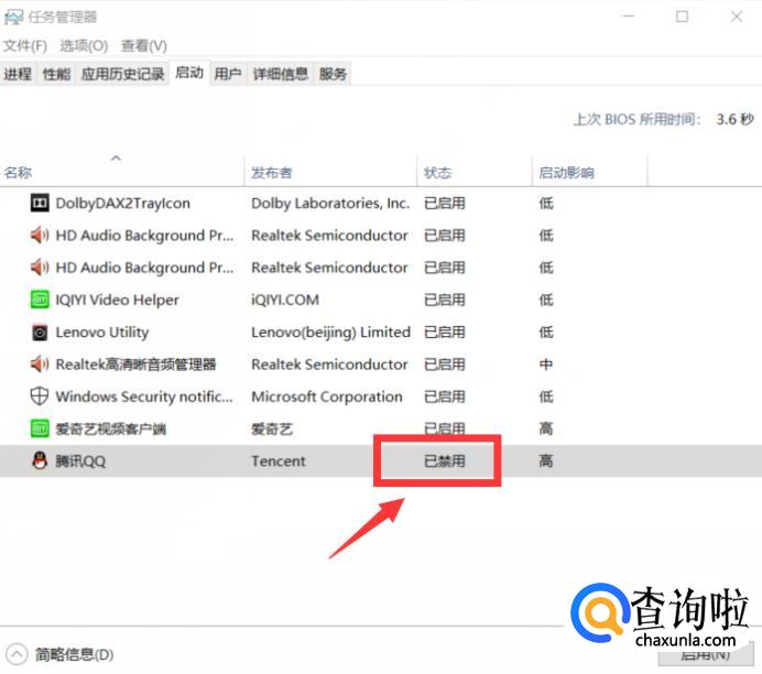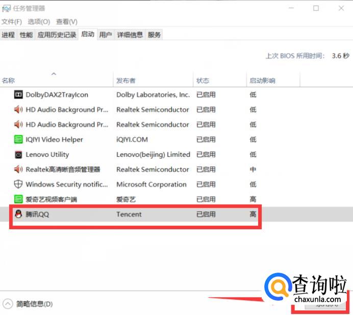在【启动】页面的下方,就有电脑中运行的软件了(下面以QQ为例),选择你需要禁用的软件,用左键点击该软件,在该页面下方选择点击【禁用】就可以了。