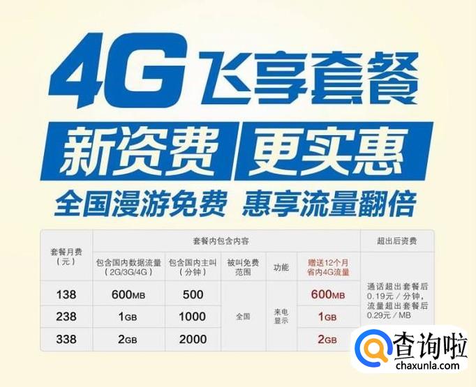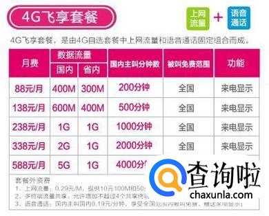 4G飞享套餐,预付费版,价格从18元到588元不等,是先付费后使用的。根据价格的不同,每个月的使用流量和语音通话时间也不同。