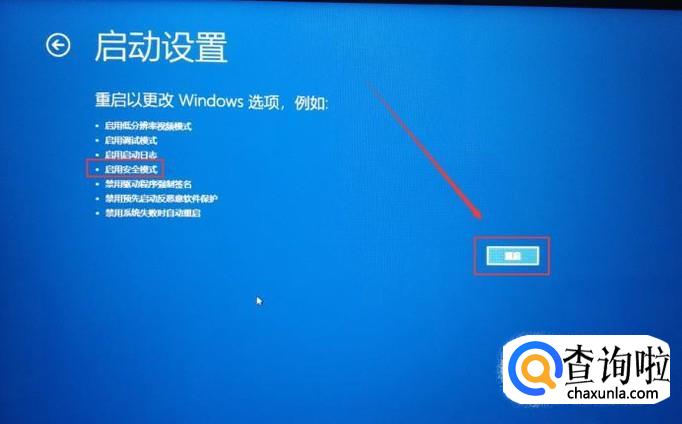 在“启动设置”中我们就能看到“启动安全模式”选项了,点击如图位置的重启按钮。