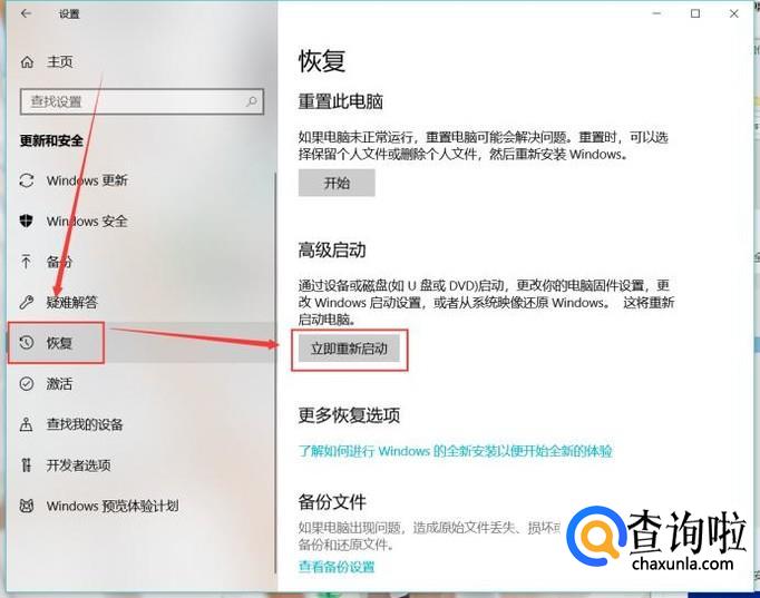 在“更新和安全”界面,点击左侧的恢复,然后在右侧界面找到立即重新启动按钮。