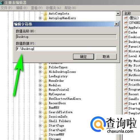 弹出的编辑框,把原来的内容删除,修改为:F:Desktop;再点确定。然后,把注册表编辑器面板关闭即可。