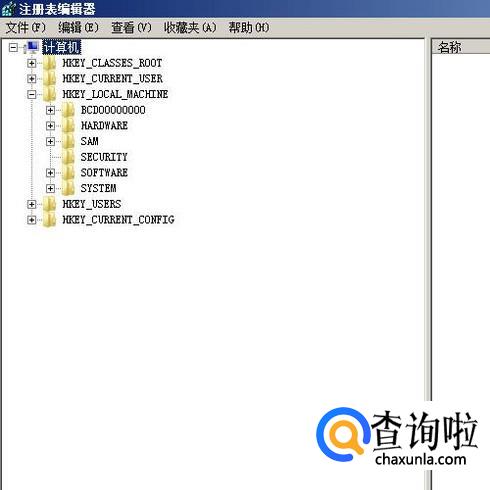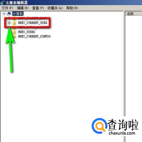 打开了注册表编辑器界面。如图所示,点击这文件夹左侧的+号,把隐藏的子文件夹给显示出来。