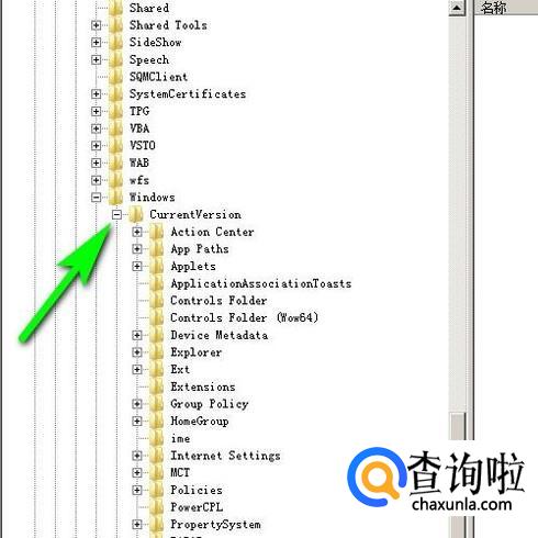 再从中找到并点击:Windows;展开隐藏的内容。在第一项“CurrentVersion”点击+号,展开其相关内容。