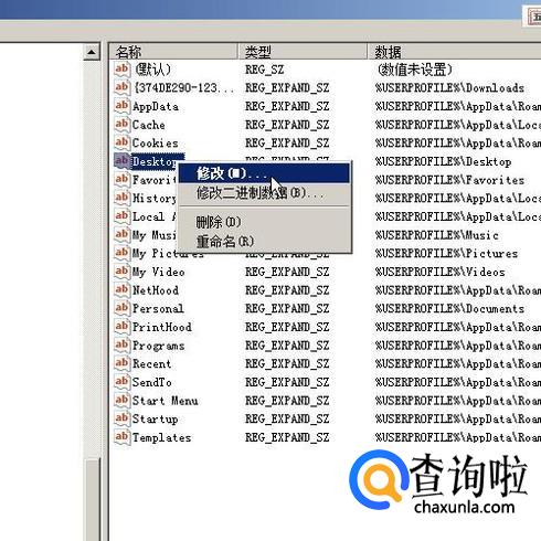 右边窗口展开了user Shell Folders相关的内容。找到并右键“Desktop”;弹出菜单再点:修改