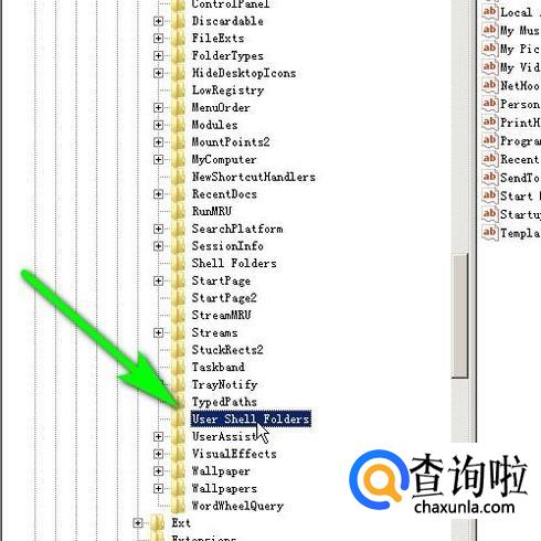 找到“Explorer”;点击左侧+号,展开的内容中再点:user Shell Folders
